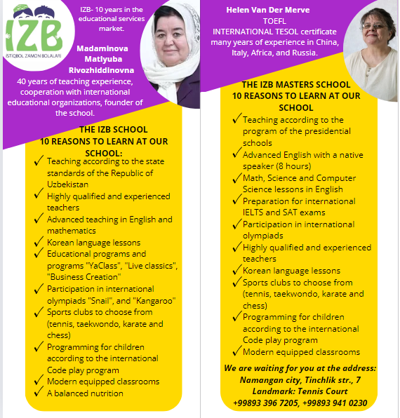 IZB Masters offers you Math and Science lessons in English, as well as advanced English with a native speaker. The teaching will be conducted according to the program of the presidential schools.
