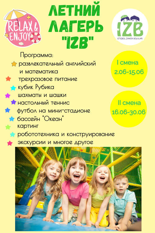 O’quv yili tugaganidan so’ng ham bizning eshiklarimiz barcha bolajonlar uchun ochiq. «IZB» yozgi oromgohi yozda bolalarini qanday qilib band qilishni bilmaydigan yoki buni yaxshi biladigan ota-onalar uchun ajoyib tanlovdir.