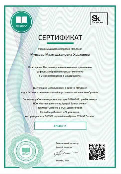 The distance learning platform Ya Klass remains to be a useful source of supplementary materials to develop and consolidate the knowledge gained in the classroom. Our students continue to make effective use of the platform, making the school’s ranking among the highest in the country. The certificate is a clear demonstration of the students’ practical performance on the platform. The IZB school ranks 2nd place among the schools in Russia for its achievements on the site. This proves that our students are striving for learning, want to gain more knowledge, are ready to expand their expertise and abilities. Such an accomplishment of our school is certainly a result of the efforts and contributions of the teachers who actively use the vast opportunities of the Ya Klass platform and involve the students.